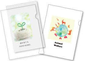 トレーシングペーパーを2つに折って下部を接着したものです。[A]のワックスファイルよりもやや薄手で華奢ですが、見た目は通常のクリアファイルにより近く、脱プラスチックをアピールできるビジネスアイテムとして、多くのご注文をいただいています。印刷は10枚から承ります。 |