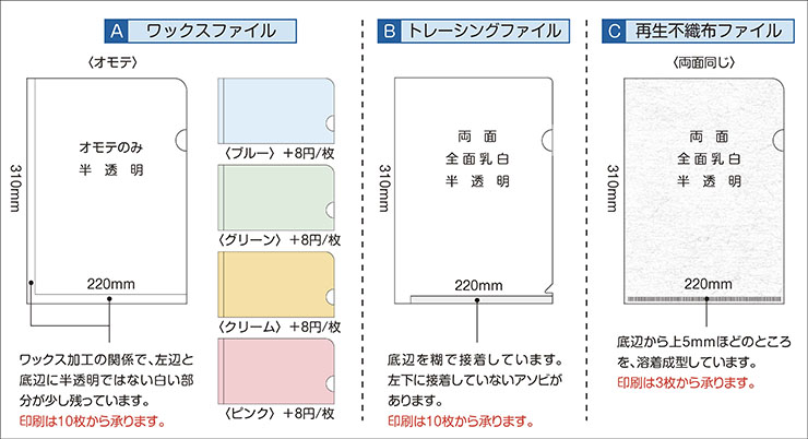再生不織布ファイル…多種類・極小ロット(3枚)のご注文に対応します。