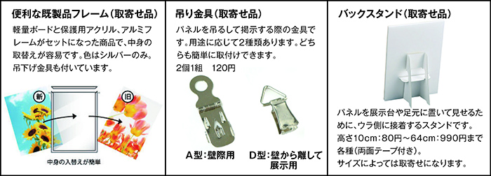 | ポスターをパネルに加工する場合の追加費用です。上記[J-1]の印刷代に、この加工賃をプラスしてください。パネル加工には以下の3通りの方法があります。パネルの最大サイズは900×1800mmです。 @印刷したポスターをパネルに貼って仕上げる……いちばん安価で短納期です。 ※パネルの厚さは2種類あります。ご注文のときに指定してください。 Aオプション:ポスターに片面ラミネート(PET50μ)をかけてから、パネルに仕上げる…表面保護ができます。 パネルに貼らず、片面ラミネートのみで納品もできます。 Bポスターをそのまま、市販の既製品フレームにはさみ込むだけ…ポスターの入れ替えができ、繰り返し使えます。 ※ライトクロスには使えません。 |