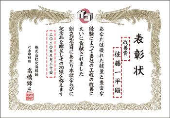 | 1)差替え部分が受賞者氏名+1か所(受賞理由等)のみ 1名:330円 2)差替え部分が受賞者氏名+2~3か所 1名:550円 3)受賞者ごとに表彰内容が大きく異なり、調整が必要 1名:770円 |